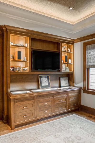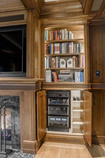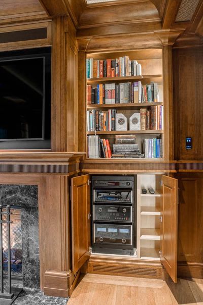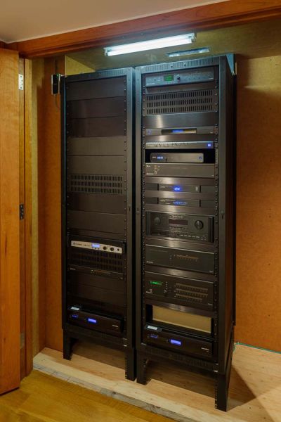 With plenty of entertainment equipment in the home, camouflage was paramount. The solutions include several vital components housed in a mechanical room, while localized devices (media players, gaming consoles, etc.) are kept in cabinets equipped with specialized fans for function and safety.