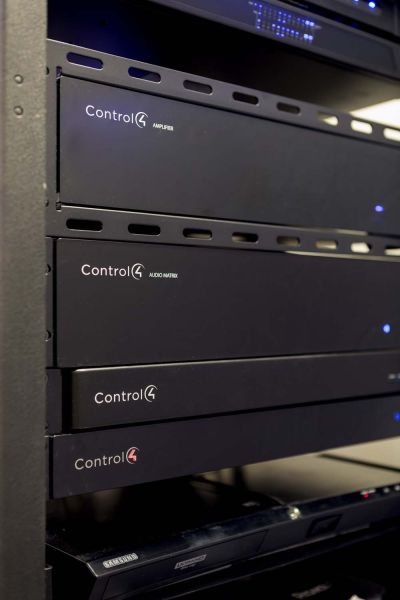 The audio, video, lighting, and networking components are easily managed with the intuitive Control4 home control platform. A centralized equipment rack is tucked away in a mechanical space on the second floor.