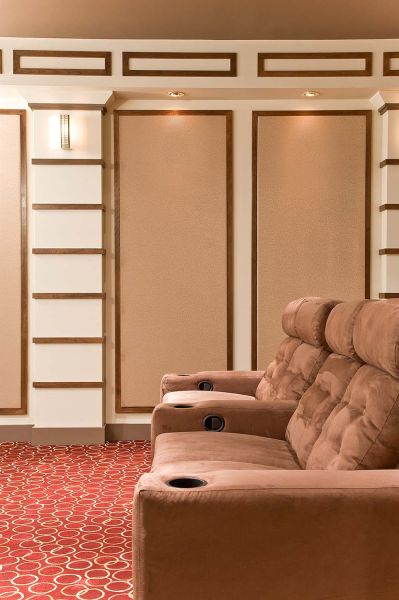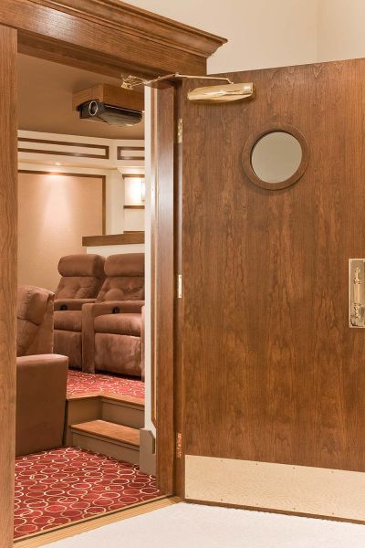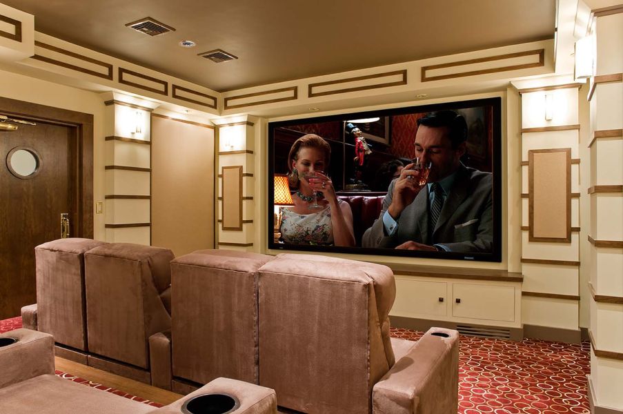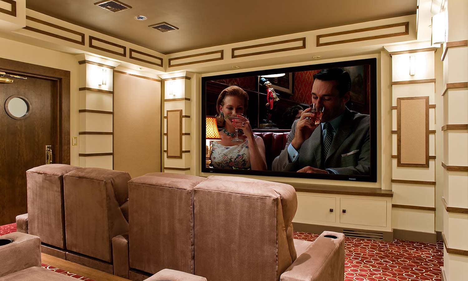 Any room can house a flatscreen and surround sound speakers, but a home theater requires more. The details include a custom, old-fashioned theater door and extensive millwork on columns, and soffits, which provide an old Hollywood ambiance. Also, the surround sound speakers and Acoustic Innovations acoustic panels are worked seamlessly into the design.