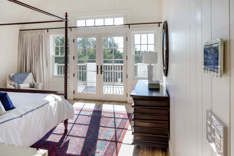 With so many oversized windows, shading is a must at Salt Marsh Way. Electronic shading is provided in many areas of the house, integrated with the lighting system keypads for ease of use. The homeowners can also use any Crestron touch panel or the Crestron app on their smart phones or tablets to open or close the shades. The shades are programmed to open and close based on the time of day and occupancy. Since the homeowners liked the chic industrial look, all of the exposed rollers had to be powder-coated black to match the aesthetics of the shades.
