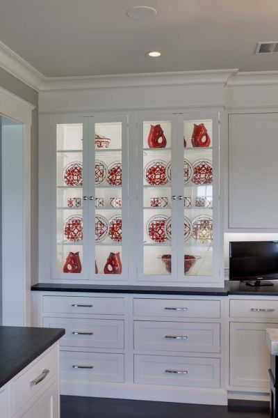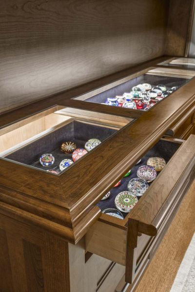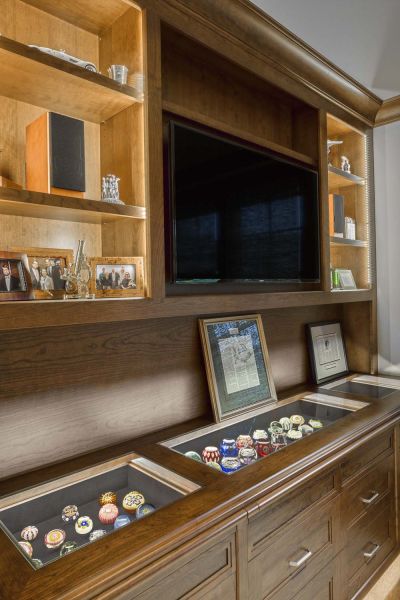 Electric shades throughout the house are programmed for privacy and light control. Interior lights are integrated with the Savant home control system for easy adjustment through in-home keypads or personal mobile devices like smartphones and tablets. In the study, a custom-lit display cabinet is a standout addition, with programmed presets based on time of day and whether display spaces are open or closed.